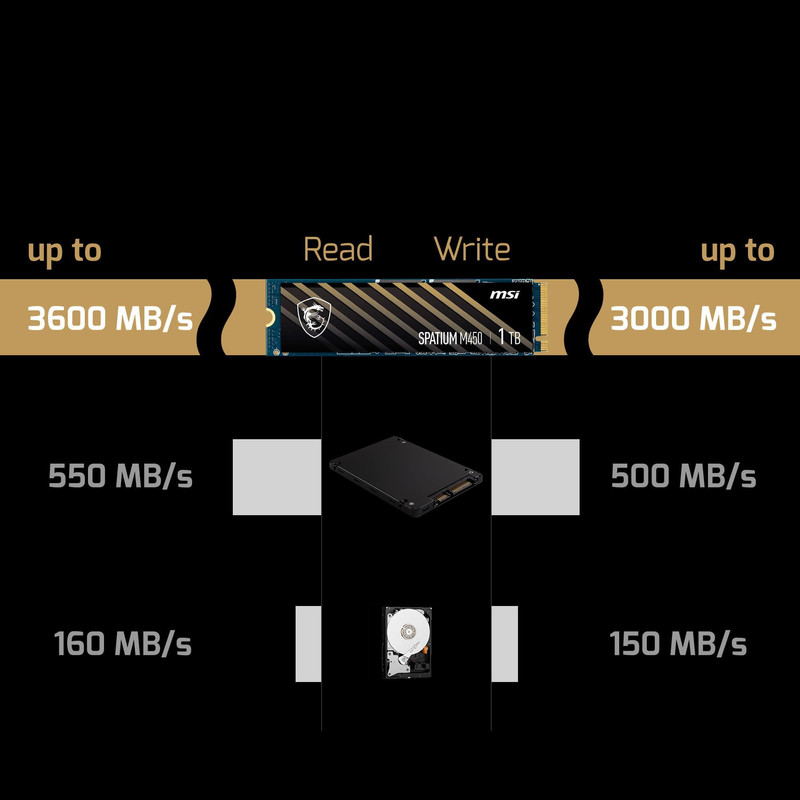 هاردها به دلیل آن که برای ذخیرهسازی اطلاعات از قسمتهای الکترومکانیکی استفاده میکنند در برابر ضربات، شوکها و لرزشها بسیار حساس هستند و احتمال آسیبدیدگی آنها و از دست رفتن اطلاعات وجود دارد اما حافظههای SSD برخلاف هارددیسکها برای انجام پردازشهای مربوط به ذخیرهسازی اطلاعات از هیچ قسمت حرکتی استفاده نمیکنند و این موضوع باعث مقاومت آنها دربرابر شوک میشود. هارد ام اس آی SPATIUM M450 PCIe 4.0 NVMe M.2 دارای ظرفیتی 500 گیگابایتی است. این هارد ابعادی برابر 80x22x2.15 میلیمتری دارد. این هارد 9700 گرم وزن دارد. این هارد قابلیت بهینه سازی عملکرد (TRIM) دارد. همچنین دارای فناوری خود نظارت، تجزیه و تحلیل و گزارش (SMART) بوده و دارای رمزگذاری و امنیت داده ها (Pyrite) است. میانگین عمر این هارد 1500000 ساعت خواهد بود.